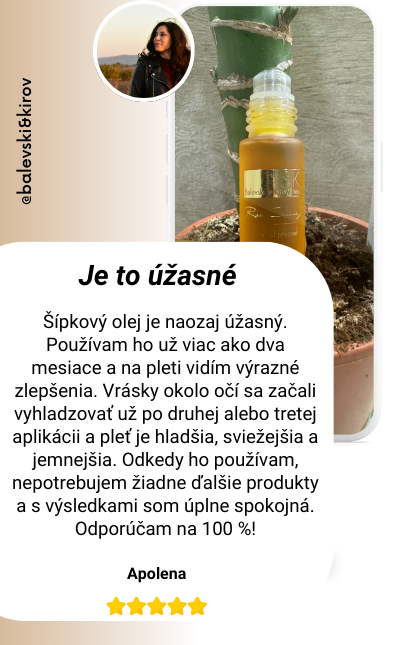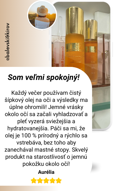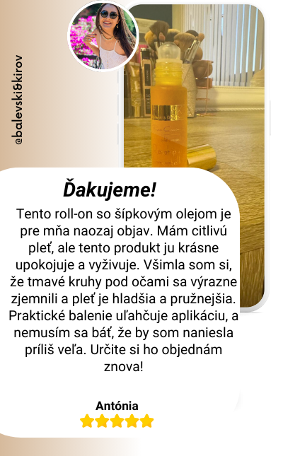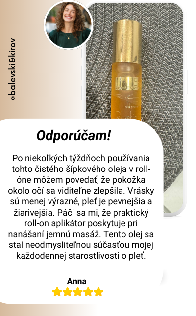 Rol-ón s šípkovým olejom je najlepšie riešenie pre očný kontúr. Pokožka okolo očí je oveľa viac hydratovaná a elastická, a tmavé kruhy sú takmer úplne preč. Páči sa mi, že nepotrebujem žiadnu inú kozmetiku – tento produkt je dostatočný na dosiahnutie požadovaných výsledkov. Určite odporúčam!